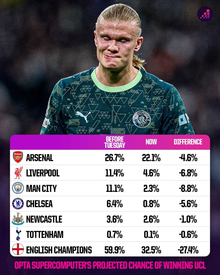 报道称,在淘汰赛之前,英超球队夺得欧冠的概率是59.9%,然而,英超6队首回合全部未能取胜,因此这一数字已经降至32.5%。