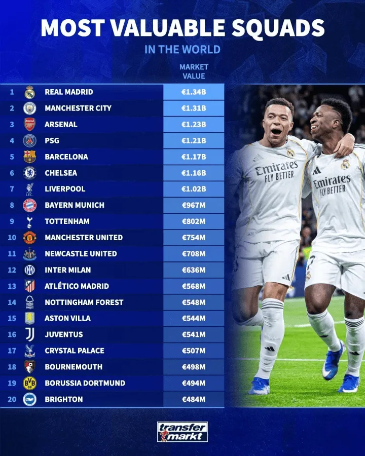 虎扑04月01日讯 德国转会市场统计了足坛目前身价最高的20家俱乐部,详情如下: